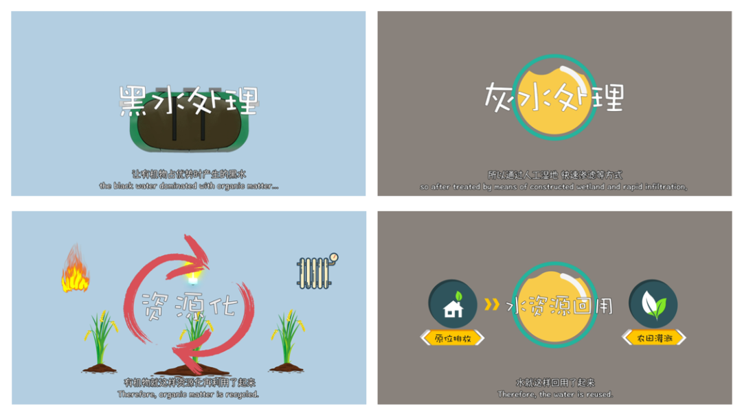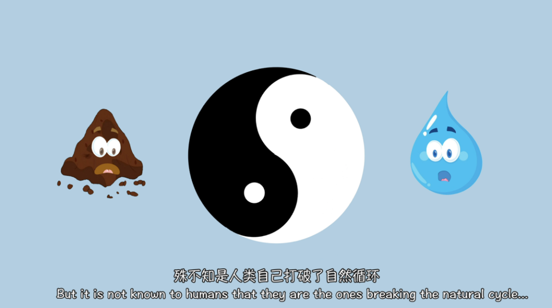创新点在于立足于对立与循环的本质关系,借用中国传统文化中太极这一对立相生的理念,以拟人的手法、诙谐幽默、生动活泼的视频动画、中英文双语字幕对大众进行污水的资源化再利用知识的介绍,向大众科普污水并不是百害无一利,只要我们对其进行合理的处理,不管是黑水还是灰水都可以为人类所用,产生新的利用价值。