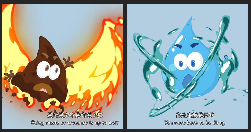 本作品以黑水和灰水的资源化再利用为主题,以水和有机物的争斗为主线结构,以生命之源(水)和生命组成物质(有机物)的诞生开篇,水和有机物相辅相成一直促进着地球上生命的演化。然而随着人类的出现和进化,在生产生活中排出的有机物污染了水,形成了污水。水的污染程度随着有机物和水比例的不同而不同,当有机物比例高时称为——黑水,当水比例高时则为——灰水。水认为:是有机物掺杂在自己体内,从而给人类生存的水环境带来了很大的危害;而有机物则认为自己是万物生长的营养物质,应该受到人类的重视。两者相持不下,以争斗的形式引出了各自的优点并对水处理的方式(厌氧发酵资源化利用黑水和人工湿地净化灰水再利用)进行了介绍。最终,由水处理神器(水处理设施)的引入把水和有机物分开,两者都找到了适合自己的位置,最后以万物循环作为点题和结尾。