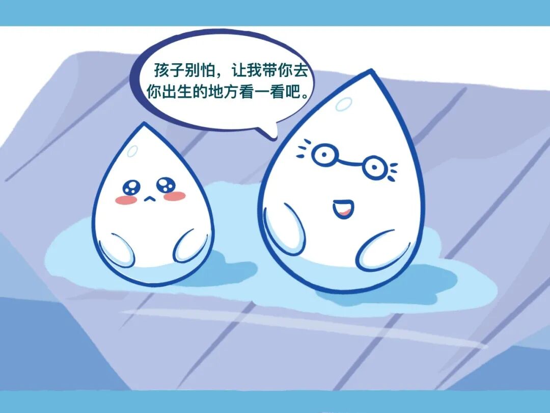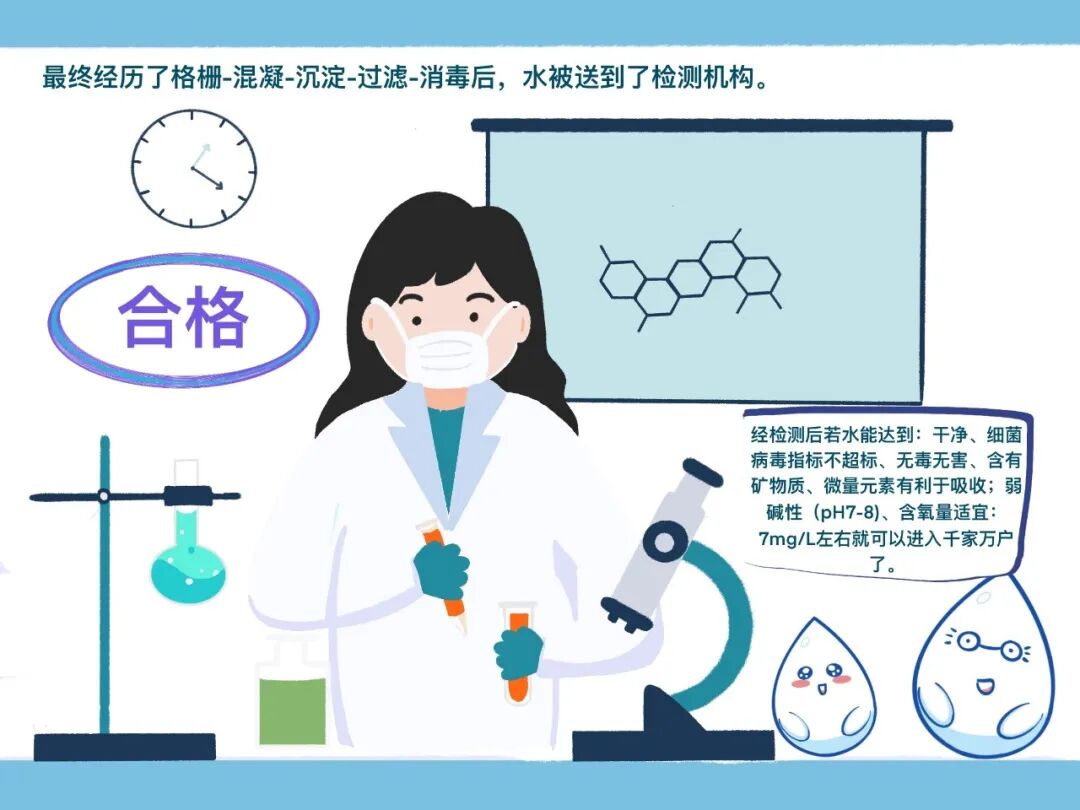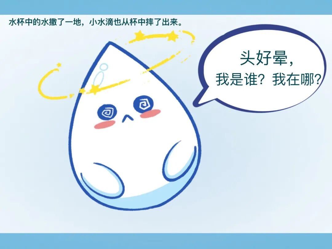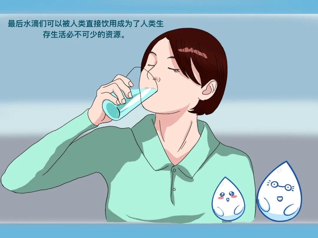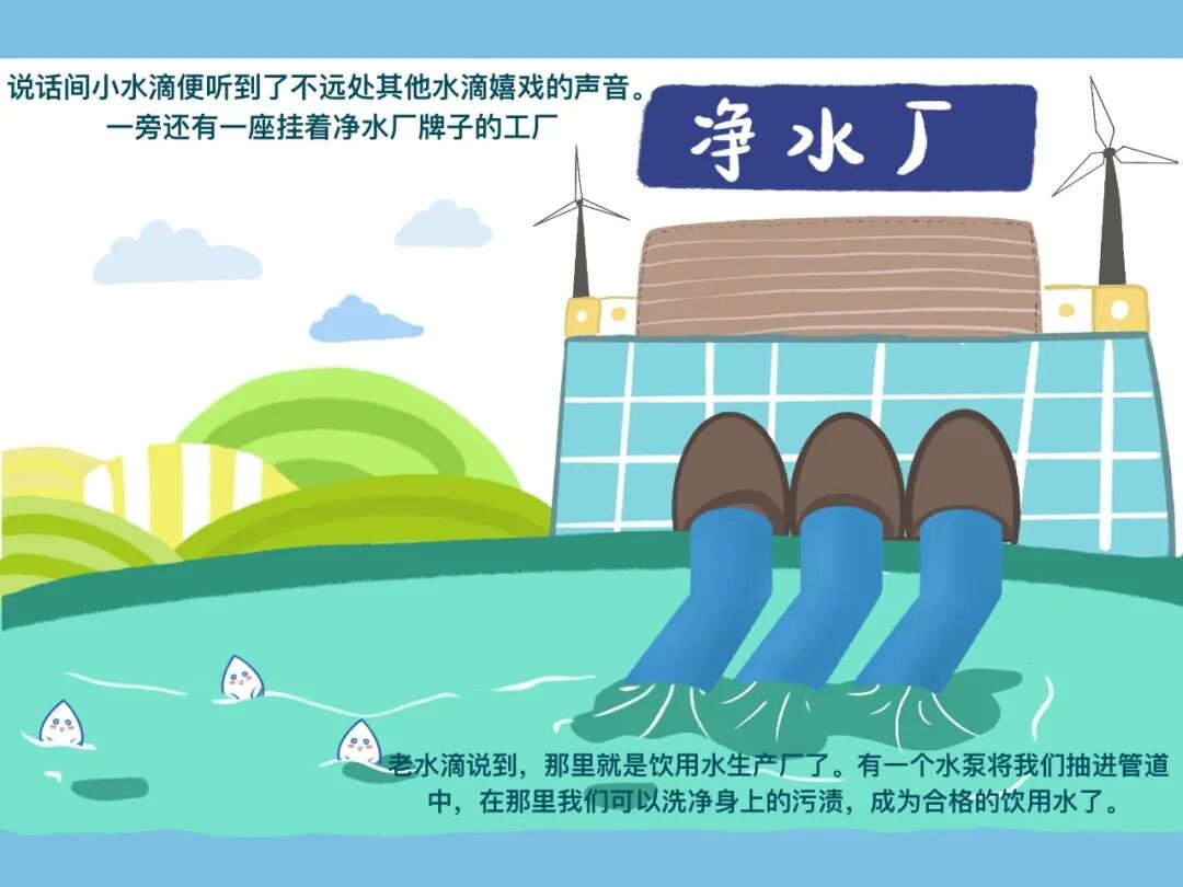为了使人们更直观的了解饮用水的来源。作品以杯中洒出的小水滴为主角,以手绘卡通为媒介并用它的第一视角叙述了饮用水的来源以及水源地的选址。并且清晰的展示了饮用水处理混凝—过滤—沉淀—消毒—检测的一系列处理过程。作品中出现的“两虫”(隐孢子虫,贾第鞭毛虫)形象为饮用水中最常见的病原微生物。“两虫”的去除使饮用水的安全性大大提高。