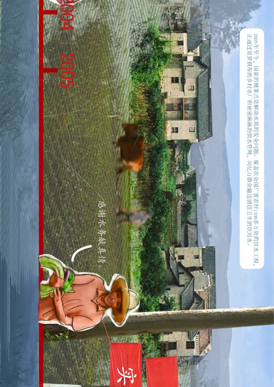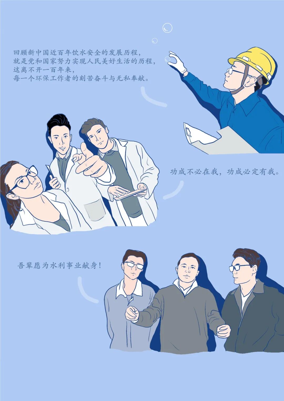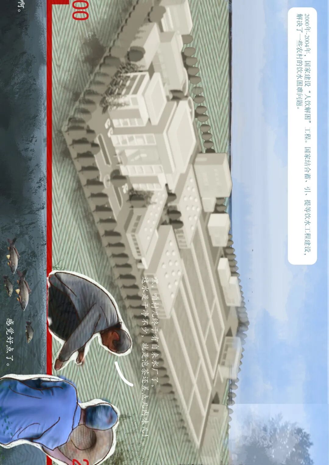 本作品以时间为线索,纵观我国农村及城市的饮水工程建设的发展历史,梳理出了一个以我国饮水发展史上的重要事件为节点的坐标轴,使大众能够清晰的了解我国的饮水工程建设的历史变化。此外,我们利用动图等更为鲜活的形式向大众更为直观地展示了饮用水处理流程。同时,我们考虑到大众对于饮用水的安全问题极为关注,另辟蹊径,致力于引导大家关注常被忽视但又对健康有影响的新型污染物,并向诙谐的语言向大众科普了一些目前较为先进的处理方法。我们希望在新型污染物的危害对饮水健康威胁越来越严重的今天,通过我们的科普活动来推动相关防治手段及措施的快速且广泛施行。这也与我们功成不必在我,功成必定有我的比赛初衷高度契合。饮水安全是重要的民生问题,让百姓们都能喝上健康的直饮水意义重大,因此,在本作品的最后,我们对未来饮水工程的建设提出了一些美好愿景,希望饮水安全进一步得到保障,并做到真正惠及全民。