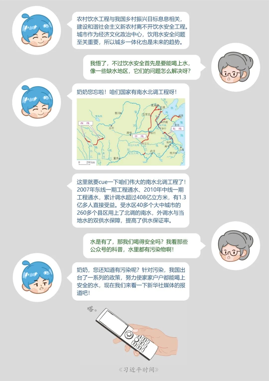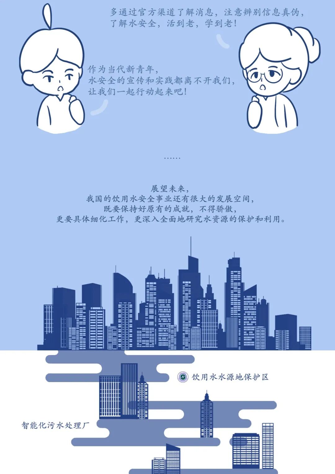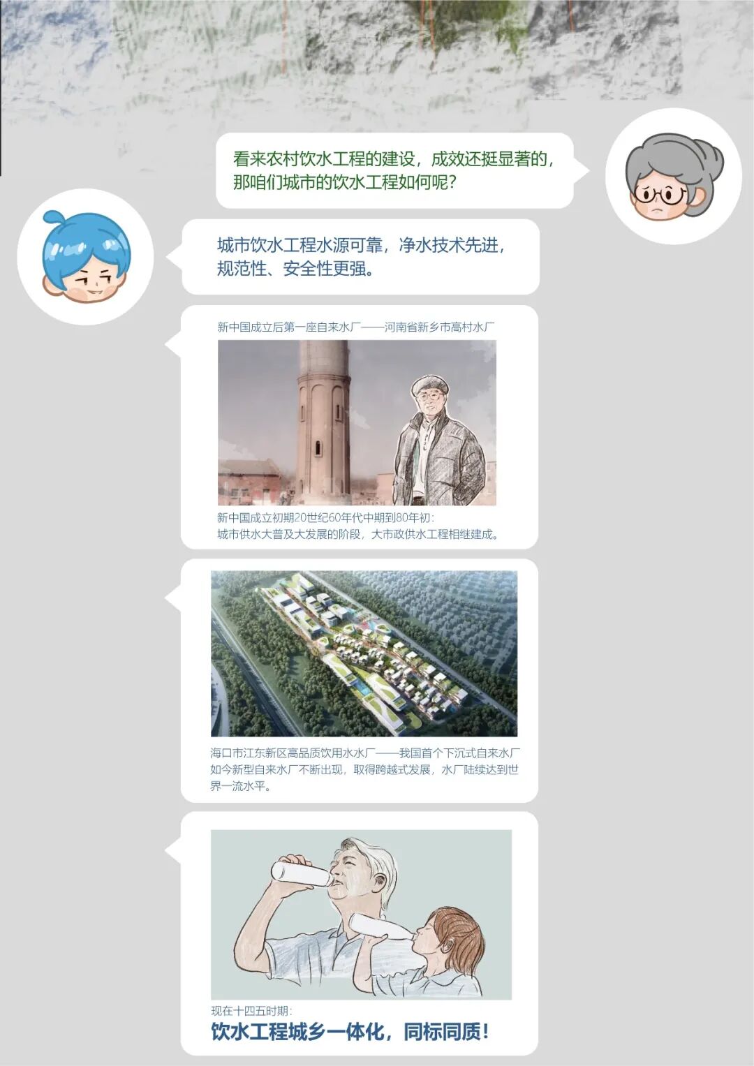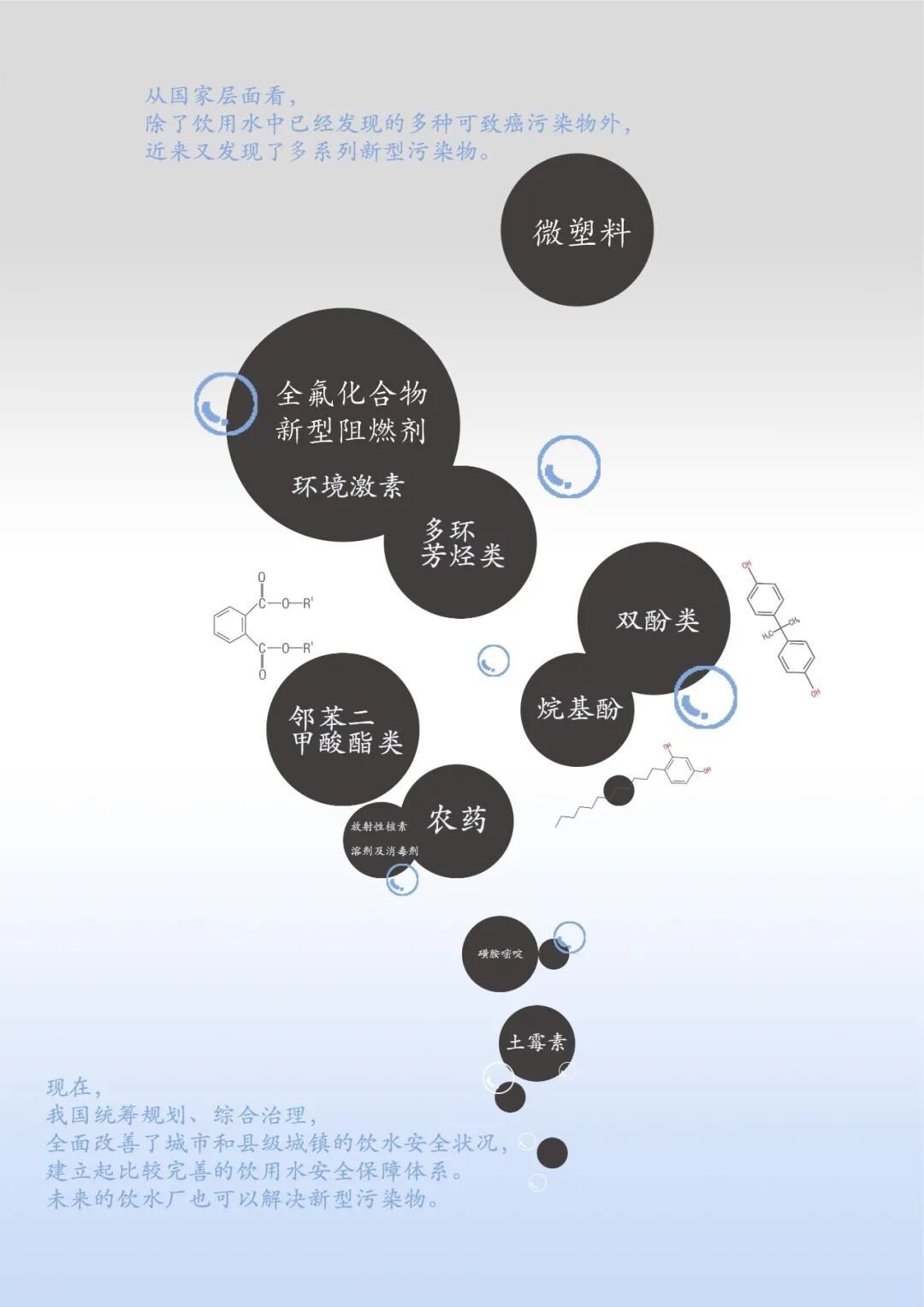 本作品以时间为线索,纵观我国农村及城市的饮水工程建设的发展历史,梳理出了一个以我国饮水发展史上的重要事件为节点的坐标轴,使大众能够清晰的了解我国的饮水工程建设的历史变化。此外,我们利用动图等更为鲜活的形式向大众更为直观地展示了饮用水处理流程。同时,我们考虑到大众对于饮用水的安全问题极为关注,另辟蹊径,致力于引导大家关注常被忽视但又对健康有影响的新型污染物,并向诙谐的语言向大众科普了一些目前较为先进的处理方法。我们希望在新型污染物的危害对饮水健康威胁越来越严重的今天,通过我们的科普活动来推动相关防治手段及措施的快速且广泛施行。这也与我们功成不必在我,功成必定有我的比赛初衷高度契合。饮水安全是重要的民生问题,让百姓们都能喝上健康的直饮水意义重大,因此,在本作品的最后,我们对未来饮水工程的建设提出了一些美好愿景,希望饮水安全进一步得到保障,并做到真正惠及全民。