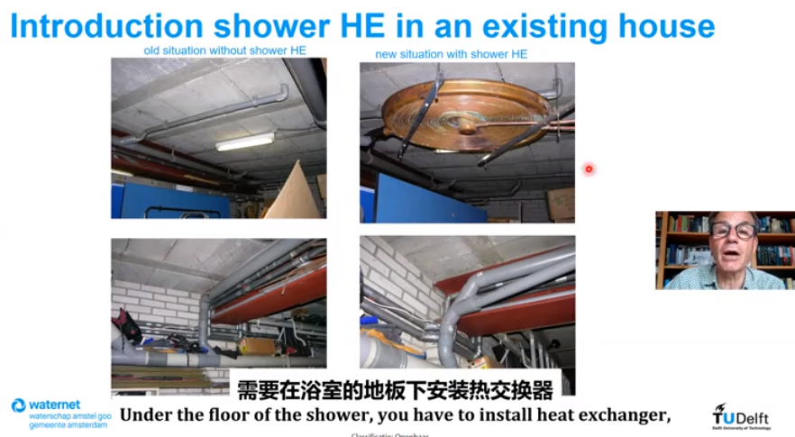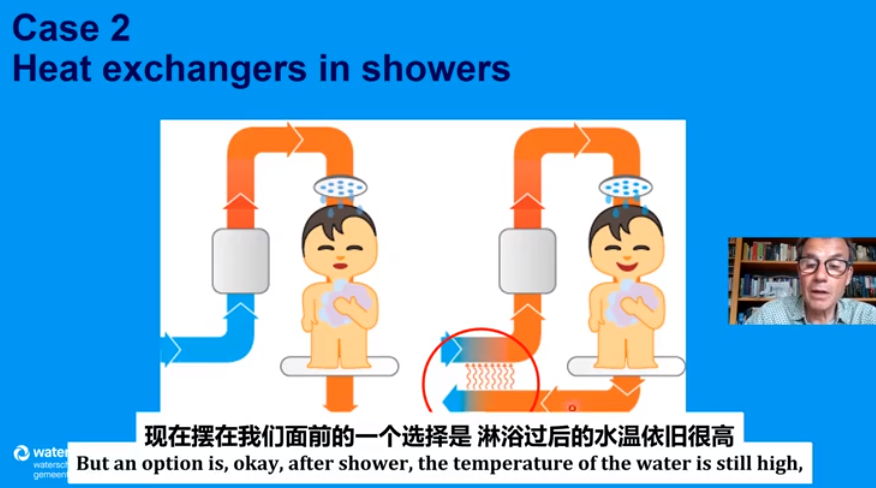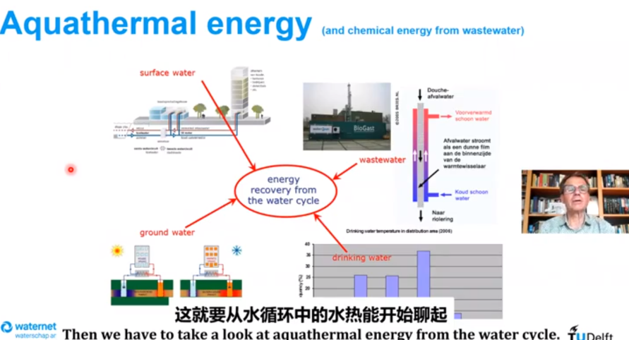 在全球温室气体减排的大背景下,荷兰阿姆斯特丹制定了相应的2050年气候中和路线图,其目标为,到2030年和2050年二氧化碳排放量分别减少55%和95%。为了实现这一目标,Waternet和代尔夫特理工大学联合开展了深入研究,检验了50多种温室气体减排的可能性,确定了不同方法实现二氧化碳减排的潜力和成本。研究发现,可以从地表水、地下水、污水和饮用水等水体循环过程中提取热能(称为水载冷热能,aquathermal energy),这部分能量可满足城市供暖、制冷等需求。因而,水载冷热能的回收在温室气体减排方面潜力巨大。van der Hoek教授通过分享两个具体案例证明了水载冷热能回收的可行性。