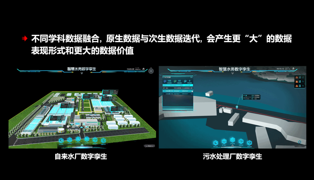 依托人工智能技术研发的管道内窥摄像检测系统和缺陷自动判读算法,可识别结构性及功能性缺陷,实现缺陷空间定位。如接口损坏、异物堵塞、渗漏等,用于评估排水管道完整性和指导管网修复。不同学科数据融合,原生数据与此生数据迭代,会产生更“大”的数据表现形式和更大的数据价值!以数字孪生赋能水厂为例,基于数字孪生引擎,可以对水厂不同工段关键参数进行监测,结合智能模型,实时优化工艺设备参数,实现智能投药、精准曝气,从而降药耗、降碳耗、降碳排。