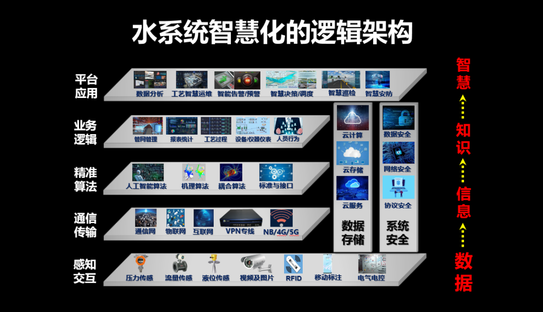 随着物联网、移动互联网、云计算等新一轮信息技术的迅速融入,水务数字化和智慧化已经成为不可逆的大趋势。哈尔滨工业大学环境学院教授王爱杰指出,水系统智慧化的基本逻辑架构,从感知层、网络层到应用层,从水物联网、互联网到云计算和智能融合技术应用,毫无疑问数据是逻辑的基底——因为获得高质量数据,是提取有效信息、形成新知识和决策智慧化的重要前提。百度智能云把智慧水务概括为设备智能化和管理智能化,这两者有赖于决策智能化。他们认为大数据是决策智能化的核心,是智慧水系统的顶层设计。