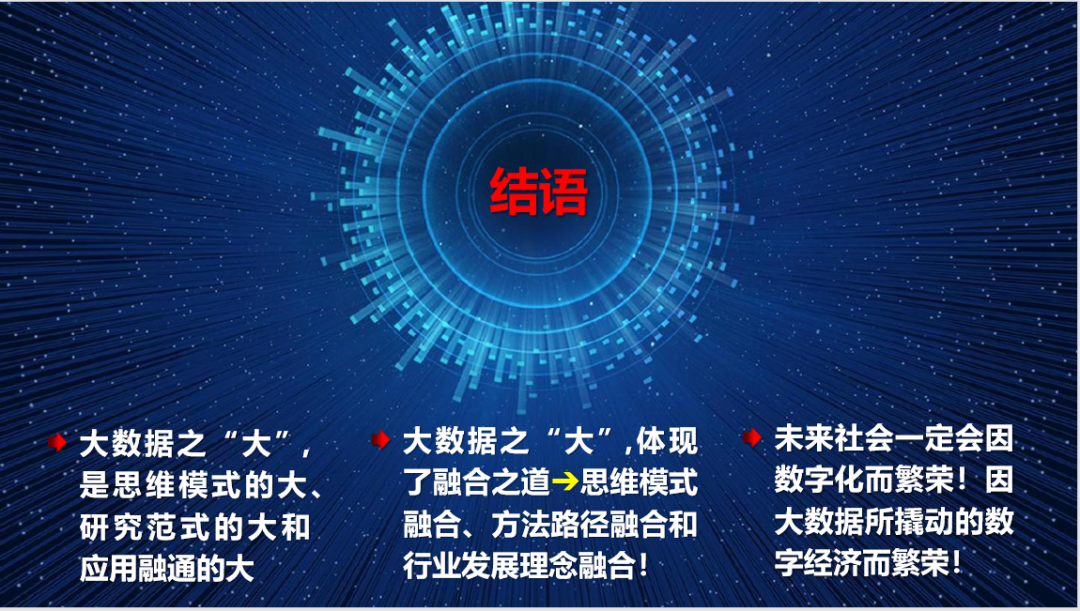 大数据之“大”,关键是思维模式的“大”、研究范式的“大”和应用融通的“大”。大数据的大,充分体现了融合之道,是思维模式 的“融合”、是方法路径的融合,更是行业发展理念的融合!其实,目前水系统的数据还远未达到“大数据”的程度。这是智慧水务平台建设的一个痛点,但也正是我们的努力方向所在。我们坚信,大数据开启了一个重大的时代转型!未来社会的竞争,一定是对大数据的竞争!未来社会的繁荣,一定是因大数据所撬动的数字经济和生态文明而繁荣!