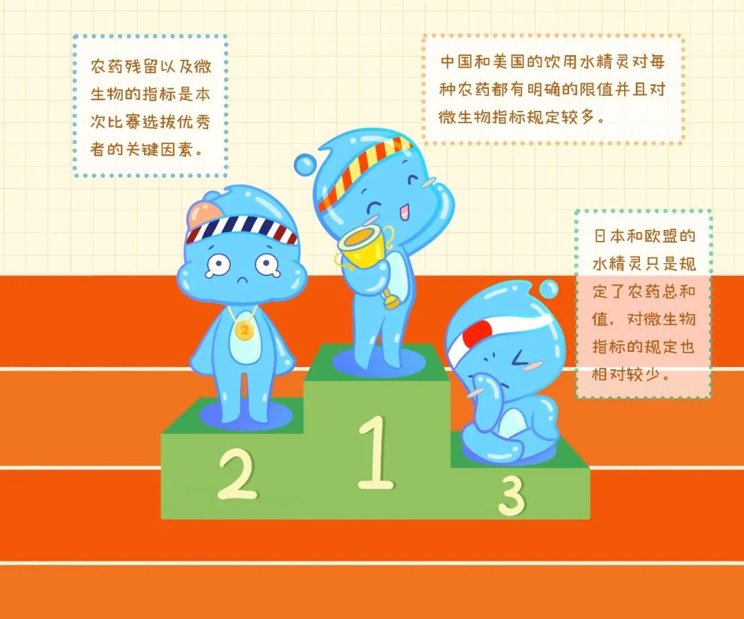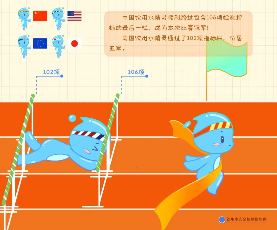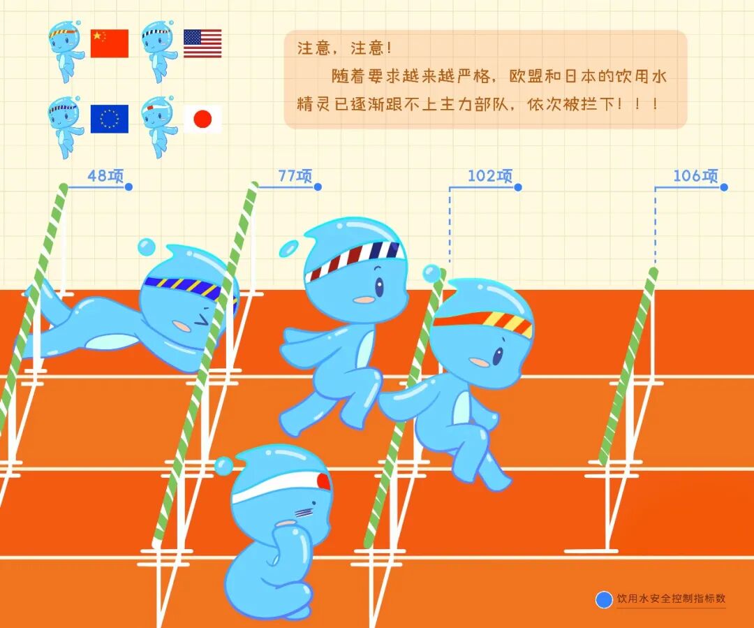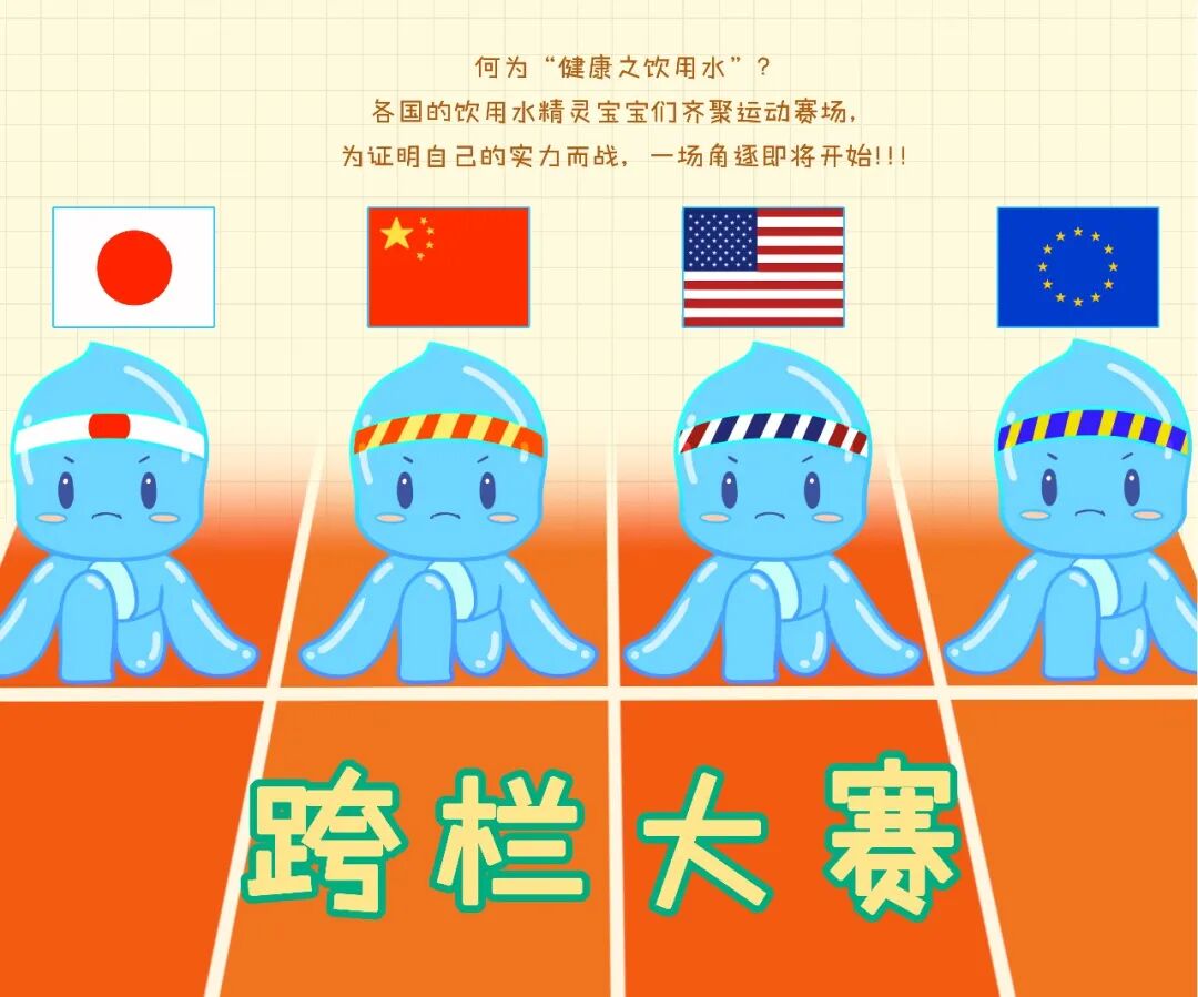 本作品以自主设计的卡通化饮用水形象—饮水宝为主体,通过田径跨栏比赛的形式,将中、日、美和欧盟四个国家和地区的饮用水质量标准进行比较,展示了各个国家和地区饮用水质量的优劣,强调了饮用水安全的重要性,科普健康安全的饮用水相关指标,倡导饮健康水,做健康人。以生动形象直观风趣的卡通竞赛故事,科普了健康饮用水的标准,提升了阅读者的兴趣和对各国标准的印象。
